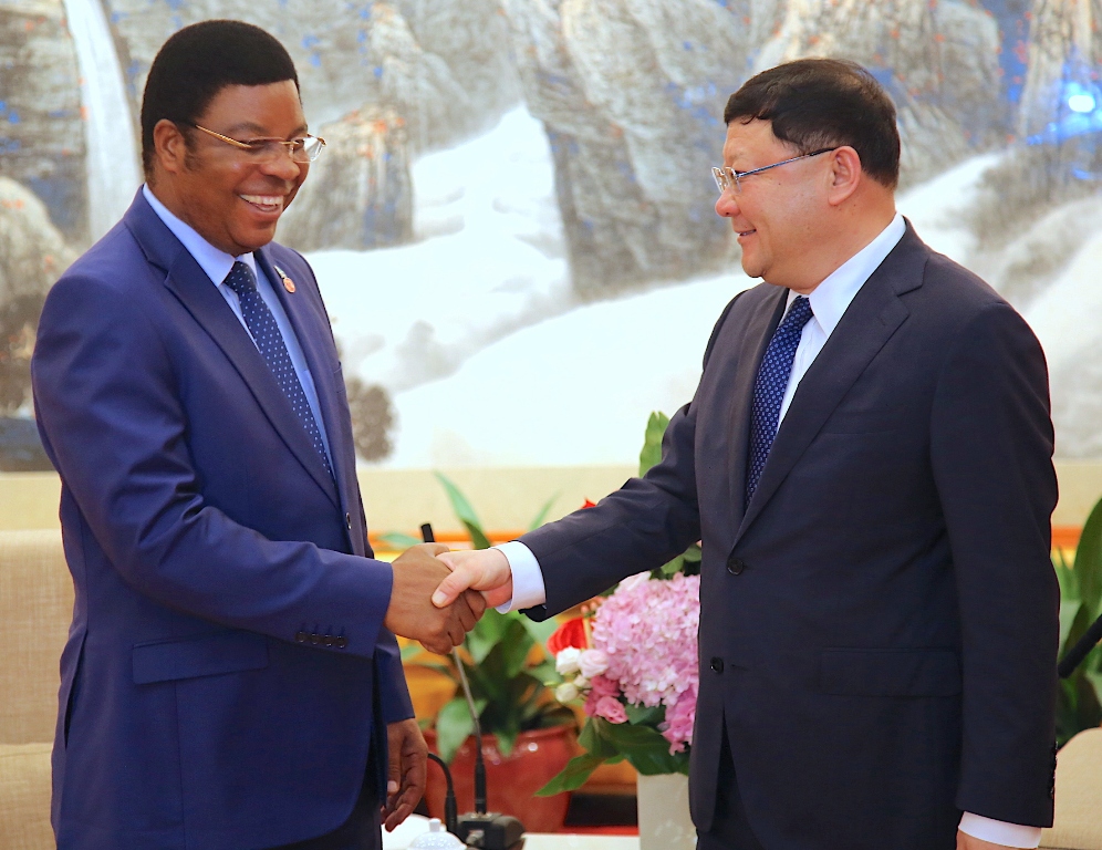 Waziri Mkuu, Kassim Majaliwa akisalimiana na Meya wa Manispaa ya Shenzhen, Bw. Wang Wanzhong kwenye ukumbi wa Hoteli ya Wuzhou nchini China, Septemba 5, 2018.