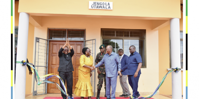 Rais wa Jamhuri ya Muungano wa Tanzania Mheshimiwa Dkt. John Pombe Magufuli akiwa na Waziri wa Elimu Profesa Joyce Ndalichako, Kaimu Mkuu wa Mkoa wa Ruvuma Godfrey Zambi, akikata utepe kuashiria uzinduzi wa chuo cha Elimu na Mafunzo ya Ufundi Stadi kilichopo Namtumbo mkoani Ruvuma.