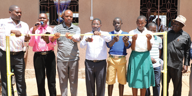 Waziri wa Nishati, Dkt Medard Kalemani (katikati) akikata utepe kuashiria kuanza kuwaka kwa umeme katika Kijiji cha Mulanda wilayani Chato. Wa kwanza kulia ni Mkuu wa Wilaya ya Chato, Eng. Mtemi Msafiri Semeon.