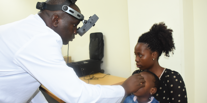 Daktari wa macho wa Hospitali ya Taifa Muhimbili-Mloganzila Geofrey Josephat akitumia kifaa maalum kumfanyia uchunguzi mtoto sehemu ya nyuma ya jicho ili kubaini kama ana tatizo. Hospitali ya Mloganzila imefanya zoezi la uchunguzi wa macho bure kwa watoto wenye umri chini ya miaka mitano ikiwa ni maadhimisho ya wiki ya saratani ya jicho kwa watoto (Retinoblastoma).
