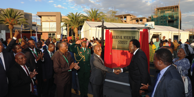 Rais wa Jamhuri ya Muungano wa Tanzania Mheshimiwa Dkt. John Pombe Magufuli akimweleza Mwenyeji wake Rais wa Namibia Mheshimiwa Dkt. Hage Geingob alichokiandika kwenye kitabu cha kumbukumbu kwa Lugha ya Kiswahili Katika kuhakikisha Kiswahili kinatangazwa kimataifa mara baada ya kuwasili katika Ikulu ya Jijini Windhoek Nchini Namibia.Mei 27, 2019Rais wa Jamhuri ya Muungano wa Tanzania Mheshimiwa Dkt. John Pombe Magufuli akifunua kitambaa na mwenyeji wake Rais wa Namibia Mheshimiwa Dkt. Hage Geingob kuashiria uzinduzi rasmi wa mtaa Julius K. Nyerere ulipo katika Jiji la Windhoek Nchini Namibia.Mei 27, 2019.Rais wa Jamhuri ya Muungano wa Tanzania Mheshimiwa Dkt. John Pombe Magufuli akiwa mwenyeji wake Rais wa Namibia Mheshimiwa Dkt. Hage Geingob alipokuwa akimuonyesha Makongoro Nyerere mtoto wa Hayati Baba wa Taifa Mwalimu Julius Nyerere mtaa mpya unaoitwa JULIUS K. NYERERE uliopo katika Jiji la Windhoek Nchini Namibia.Mei 27, 2019.Rais wa Jamhuri ya Muungano wa Tanzania Mheshimiwa Dkt. John Pombe Magufuli akipiga makofi na mwenyeji wake Rais wa Namibia Mheshimiwa Dkt. Hage Geingob mara baada ya kuzindua mtaa mpya wa Hayati Baba wa Taifa Mwalimu Julius K. Nyerere unaoitwa JULIUS K. NYERERE uliopo katika Jiji la Windhoek Nchini Namibia.Mei 27, 2019Rais wa Jamhuri ya Muungano wa Tanzania Mheshimiwa Dkt. John Pombe Magufuli akipongezana na mwenyeji wake Rais wa Namibia Mheshimiwa Dkt. Hage Geingob mara baada ya kuzindua mtaa mpya wa Hayati Baba wa Taifa Mwalimu Julius K. Nyerere unaoitwa JULIUS K. NYERERE uliopo katika Jiji la Windhoek Nchini Namibia.Mei 27, 2019Mtaa mpya wenye jina Hayati Baba wa Taifa Mwalimu Julius K. Nyerere unaoitwa JULIUS K. NYERERE ukifunuliwa rasmi mara baada ya kuzinduliwa na Rais wa Jamhuri ya Muungano wa Tanzania Mheshimiwa Dkt. John Pombe Magufuli na mwenyeji wake Rais wa Namibia Mheshimiwa Dkt. Hage Geingob katika Jiji la Windhoek Nchini Namibia. Mei 27, 2019Rais wa Jamhuri ya Muungano wa Tanzania Mheshimiwa Dkt. John Pombe Magufuli akifurahi na mwenyeji wake Rais wa Namibia Mheshimiwa Dkt. Hage Geingob wakati wa hafla ya kuzindua mtaa mpya wa Hayati Baba wa Taifa Mwalimu Julius K. Nyerere unaoitwa JULIUS K. NYERERE uliopo katika Jiji la Windhoek Nchini Namibia. Mei 27, 2019Rais wa Jamhuri ya Muungano wa Tanzania Mheshimiwa Dkt. John Pombe Magufuli akifurahi na mwenyeji wake Rais wa Namibia Mheshimiwa Dkt. Hage Geingob wakati wa hafla ya kuzindua mtaa mpya wa Hayati Baba wa Taifa Mwalimu Julius K. Nyerere unaoitwa JULIUS K. NYERERE uliopo katika Jiji la Windhoek Nchini Namibia. Mei 27, 2019Rais wa Jamhuri ya Muungano wa Tanzania Mheshimiwa Dkt. John Pombe Magufuli akiwapongeza Watanzania wanaoishi Namibia mara baada ya kuzindua mtaa mpya wa Hayati Baba wa Taifa Mwalimu Julius K. Nyerere unaoitwa JULIUS K. NYERERE uliopo katika Jiji la Windhoek Nchini Namibia.Mei 27, 2019