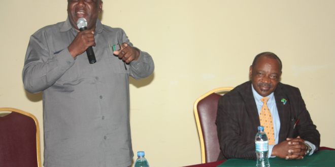 Katibu Mkuu Wizara ya Katiba na Sheria Prof. Sifuni Mchome akizungumza na Waziri wa Mambo ya Ndani Mhe. Kangi Lugola alipowasili katika hoteli ya St. Gasper jijini Dodoma kukitembelea kikosi kazi kinachofanya mapitio ya mfumo wa haki jinai nchini na kuzungumza nacho.