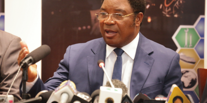 Waziri Mkuu Kassim Majaliwa akzungumza mbele ya Waandishi wa Habari (hawapo pichani), leo kuhusu kuwahamasisha Watanzania kutembelea Wiki ya Maonesho ya Biashara ya nchi za SADC yanayoendelea katika ukumbi wa Kimataifa wa Mwalimu Nyerere jijjini Dar es Salaama ili kuona bidhaa mbalimbali zinazozalishwa.Pichanu kushoto ni Waziri wa Mambo ya Nje na Ushirikiano wa Afrika Mashariki Mh Prof.Palamagamba Kabudi,kulia ni Waziri wa Viwanda na Biashara ,Mh.Innocent Bashungwa