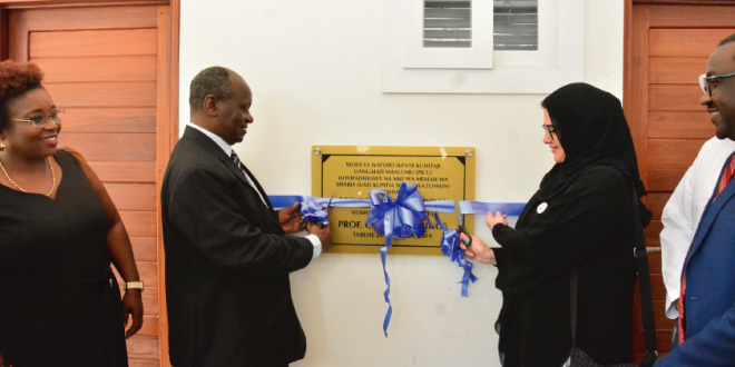 Mwakilishi wa Malkia wa Sharja, Dkt. Sawsan Abdul Salam Al Madhi akizungumza katika Hospitali ya Taifa Muhimbili (MNH) kabla ya kuzinduliwa kwa ICU mbili za watoto wanaohitaji uangalizi maalumu ya PICU na NICU. Kushoto ni Mjumbe wa Bodi ya Wadhamini wa MNH, Dkt. Ellen Senkoro.
