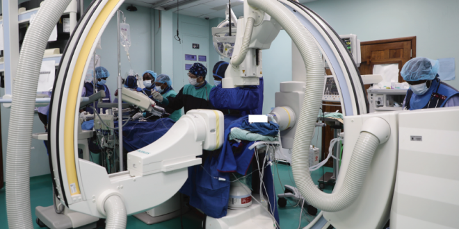 Wataalamu wabobezi wa moyo na wazibuaji wa mishipa ya damu ya moyo wa Taasisi ya Moyo Jakaya Kikwete (JKCI) wakimzibua mgonjwa mshipa mkubwa unaopeleka damu kwenye mapafu kwa ajili ya kusafishwa ambao ulikuwa umeziba na kusababisha damu kushindwa kusafishwa vizuri. Upasuaji huo wa bila kufungua kifua unafanyika kwa kutumia mtambo wa Cathlab (Catheterization Laboratory) ambapo mgonjwa anatobolewa tundu dogo katika mshipa wa damu ulioko kwenye paja.