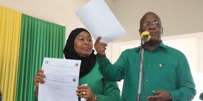 Tanzania Dkt. John Pombe Magufuli akionesha Ilani ya Uchaguzi wakati