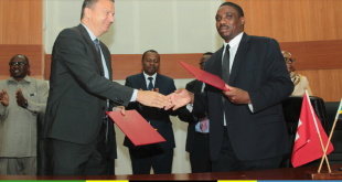 Katibu Mkuu wa Wizara ya Fedha na Mipango, Bw. Doto James (kulia) na Balozi wa Uswiss nchini Tanzania Mhe. Didier Chassot,wakionesha Mikataba miwili ya msaada wa Faranga za Uswis milioni 17.8 sawa na Sh. bilioni 44.1 kwa ajili ya kugharamia Awamu ya Pili ya Mpango wa Kunusuru Kaya Masikini (TASAF) …