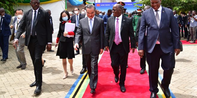 Rais wa Jamhuri ya Muungano wa Tanzania Mheshimiwa Dkt. John Pombe Magufuli akiwa katika picha ya pamoja na Waziri wa Mambo ya Nje wa China Wang Yi mara baada ya kuzungumza na wageni mbalimbali katika hafla fupi ya utiaji saini wa Ujenzi wa Reli ya Kisasa SGR kutoka Mwanza hadi Isaka mkoani Shinyanga km 341 kati ya Shirika la Reli Tanzania TRC na Ubia wa Kampuni mbili za Kichina, China Civil Engineering Construction Corporation CCECC na China Railway Construction Corporation Limited CRCC.