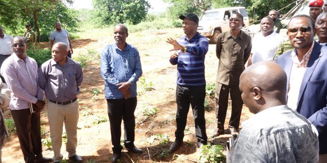 Waziri wa Mifugo na Uvuvi Mhe. Mashimba Ndaki (aliyenyoosha mkono) akiwa katika eneo ambalo inadaiwa wafugaji walimuua Bw. Emelian Malima miaka 45 ambaye alikuwa akifanya shughuli za kilimo katika ukanda wa malisho ya mifugo katika Wilaya ya Kiteto Mkoani Manyara, ambapo Waziri Ndaki amechukizwa na kitendo hicho cha wananchi kujichukulia sheria mkononi na kutaka iwe mwanzo na mwisho. (Picha na Edward Kondela – Afisa Habari, Wizara ya Mifugo na Uvuvi)