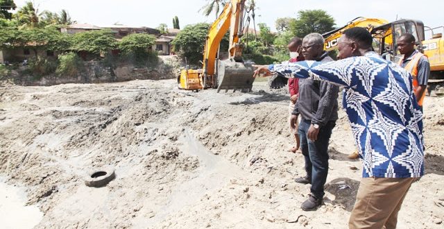 Muonekano wa Daraja la Jangwani jijini Dar es Salaam ambalo kazi ya uchimbuaji tope ili kudhibiti mafuriko pindi mvua za masika zitakapoanza baadaye mwezi ujao.Katibu Mkuu Wizara ya Ujenzi na Uchukuzi (Sekta ya Ujenzi) Arch. Elius Mwakalinga akisisitiza jambo kwa Meneja Mradi wa Usafishaji Daraja la Jangwani, Eng. Elisony Mweladzi mara baada ya kukagua zoezi la uchimbuaji tope katika Daraja la Jangwani jijini Dar es Salaam ili kudhibiti mafuriko pindi mvua za masika zitakapoanza baadaye mwezi ujao.Katibu Mkuu Wizara ya Ujenzi na Uchukuzi (Sekta ya Ujenzi) Arch. Elius Mwakalinga akiwapongeza baadhi ya wafanyakazi wanaoendesha zoezi la uchimbuaji tope katika Daraja la Jangwani jijini Dar es Salaam.Meneja Mradi wa Usafishaji Daraja la Jangwani, Eng. Elisony Mweladzi (kulia) akifafanua jambo kwa Katibu Mkuu Wizara ya Ujenzi na Uchukuzi (Sekta ya Ujenzi) Arch. Elius Mwakalinga alipokagua maendeleo ya zoezi la uchimbuaji tope katika Daraja la Jangwani jijini Dar es Salaam ili kudhibiti mafuriko pindi mvua za masika zitakapoanza baadaye mwezi ujao. Kushoto ni Mhandisi kutoka Wizara ya Ujenzi, Hashim Kabanda.