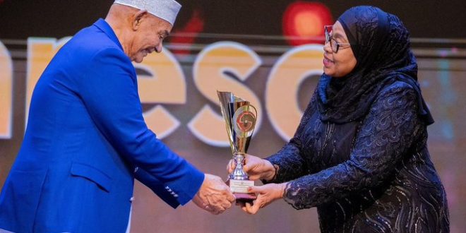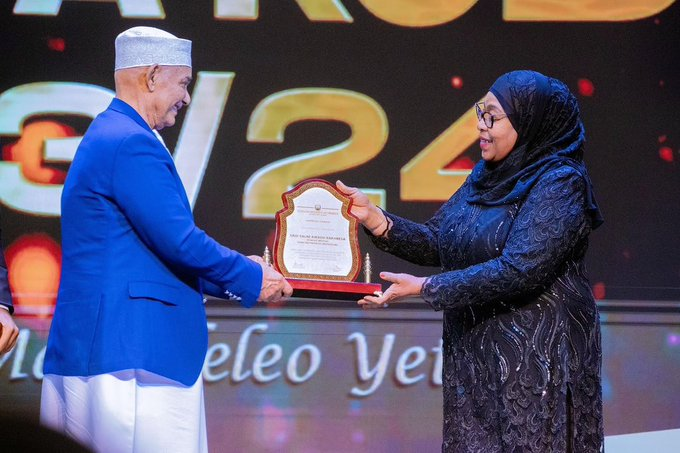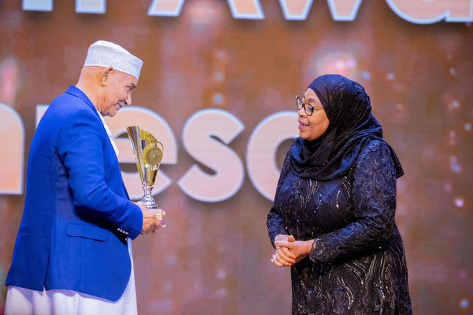 Rais wa Jamhuri ya Muungano wa Tanzania Mhe. Dkt. Samia Suluhu Hassan akikabidhi Tuzo ya mlipa kodi binafsi mwenye hadhi ya juu, Mmiliki wa Kampuni za Bakhresa Group, Said Salim Bakhresa kwenye hafla iliyofanyika Masaki Jijini Dar es Salaam tarehe 23 Januari, 2025