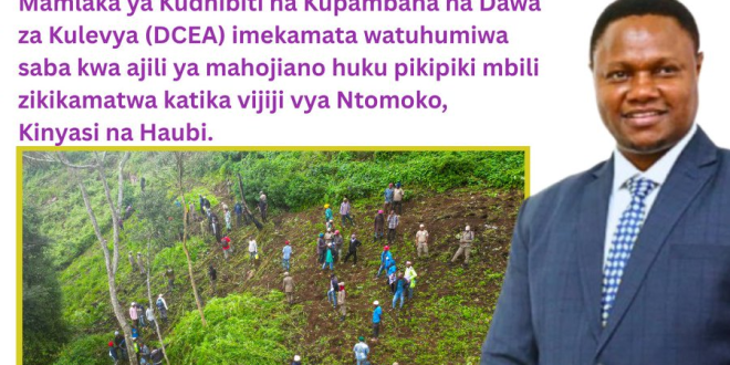 Mamlaka ya Kudhibiti na Kupambana na Dawa za Kulevya (DCEA) imekamata watuhumiwa saba kwa ajili ya mahojiano huku pikipiki mbili zikikamatwa katika vijiji vya Ntomoko, Kinyasi na Haubi
