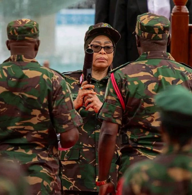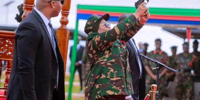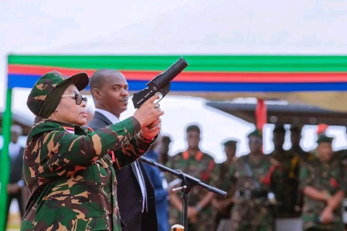Rais wa Jamhuri ya Muungano wa Tanzania na Amiri Jeshi Mkuu, Dkt. Samia Suluhu Hassan akipiga light pistol juu kuashiria uzinduzi wa jengo la Makao Makuu ya Ulinzi wa Taifa (MMUT), Kikombo Mkoani Dodoma tarehe 24 Februari, 2026.