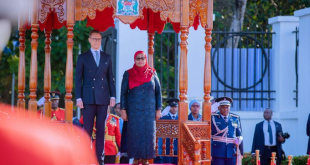 Rais wa Jamhuri ya Muungano wa Tanzania, Mhe. Dkt. Samia Suluhu Hassan akiwa amesimama na mgeni wake Rais wa Jamhuri ya Finland Mhe. Alexander Stubb wakati wimbo wa Taifa wa Tanzania na ule wa Finland ukiimbwa katika viwanja vya Ikulu Jijini Dar es Salaam tarehe 14 Mei, 2025