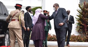 Rais wa Jamhuri ya Muungano wa Tanzania Mheshimiwa Samia Suluhu Hassan akisalimiana na Rais wa Kenya Uhuru Muigai Kenyatta mara baada ya kuwasili katika Ikulu ya Nairobi nchini Kenya leo tarehe 04 Aprili, 2021. Rais wa Jamhuri ya Muungano wa Tanzania Mheshimiwa Samia Suluhu Hassan akiwa amesimama pamoja na Rais …